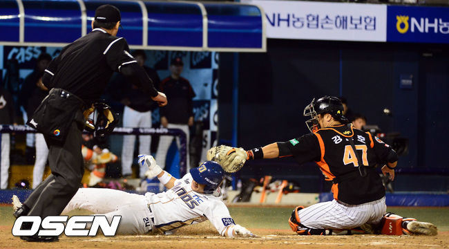9일 오후 경남 마산구장에서 열린 '2014 한국야쿠르트 세븐 프로야구' NC 다이노스와 롯데 자이언츠의 경기, 8회말 2사 1,2루 이종욱의 1타점 적시타로 2루주자 이상호가 홈으로 쇄도하고 있다.