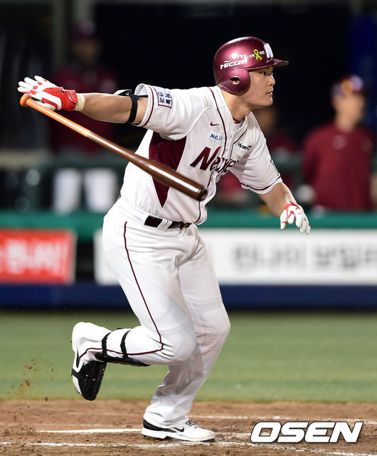 8회말 1사 2,3루에서 넥센 이성열이 동점 적시타를 날리고 타구를 바라보고 있다.