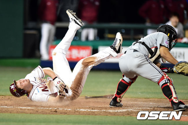 8회말 1사 만루에서 넥센 이성열이 윤석민의 좌익수 희생플라이에 태그업, 홈에서 슬라이딩하며 세이프되고 있다.