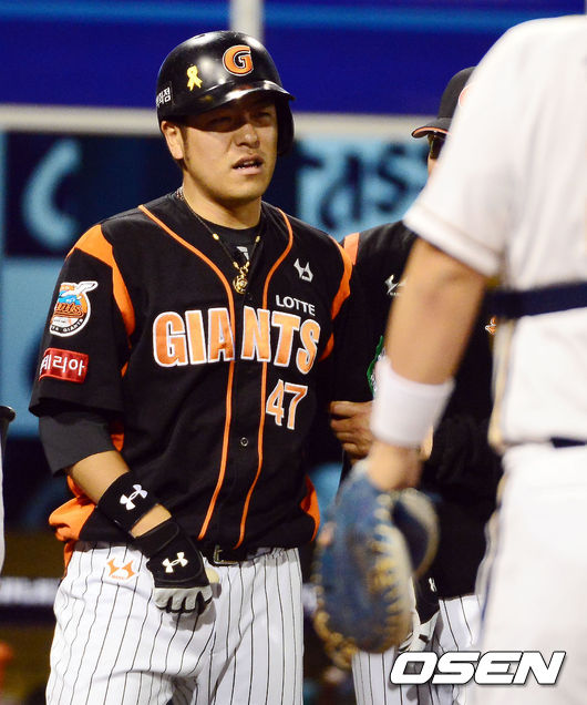 9일 오후 경남 마산구장에서 열린 '2014 한국야쿠르트 세븐 프로야구' NC 다이노스와 롯데 자이언츠의 경기, 10회초 선두타자 강민호가 NC 원종현이 던진 공을 맞고 고통을 호소하고 있다.
