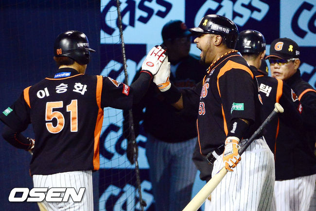 9일 오후 경남 마산구장에서 열린 '2014 한국야쿠르트 세븐 프로야구' NC 다이노스와 롯데 자이언츠의 경기, 10회초 2사 1,3루 전준우의 2타점 적시타로 홈을 밟은 1루주자 이승화가 덕아웃에서 히메네스와 하이파이브를 나누고 있다.
