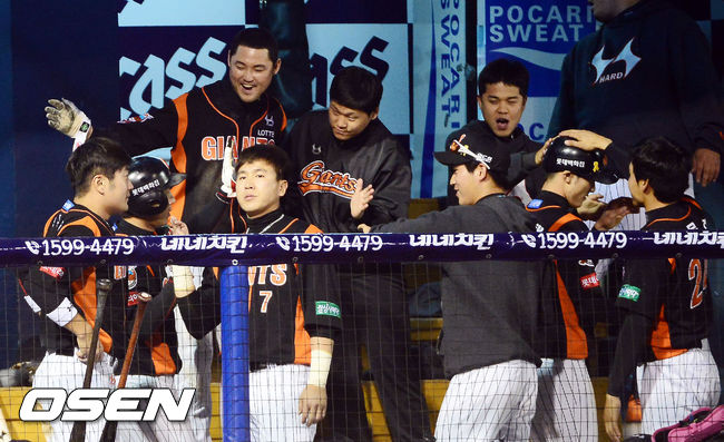 9일 오후 경남 마산구장에서 열린 '2014 한국야쿠르트 세븐 프로야구' NC 다이노스와 롯데 자이언츠의 경기, 연장 10회초 2사 1,3루 전준우의 2타점 적시타로 홈을 밟은 이승화 오승택이 덕아웃에서 동료들로부터 환영을 받고 있다.