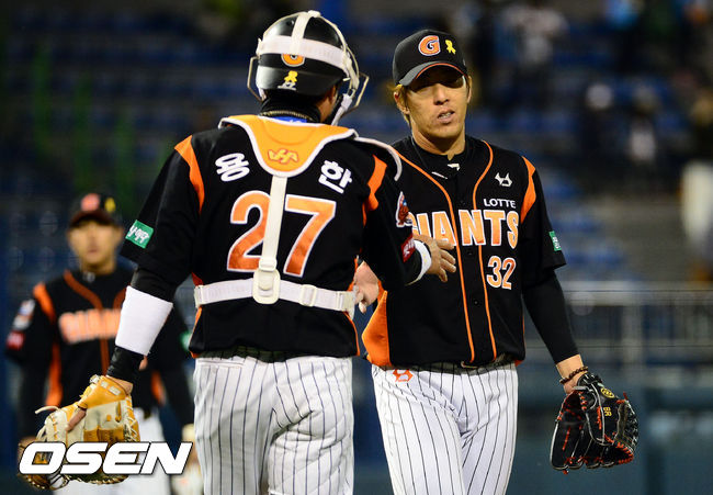 경기종료 후, 승리한 롯데 용덕한과 김승회가 인사를 나누고 있다. /ouxou@osen.co.kr