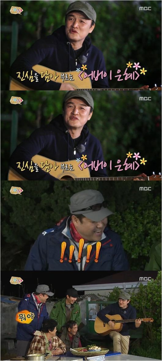박중훈은 9일 방송된 MBC 예능프로그램 ‘사남일녀’에서 가상 부모에게 고마운 마음을 전하기 위해 ‘어버이 은혜’를 기타 연주와 함께 열창했다. 그는 잔잔하게 부르다가 갑자기 록 버전으로 편곡해 유쾌한 분위기를 이끌었다.