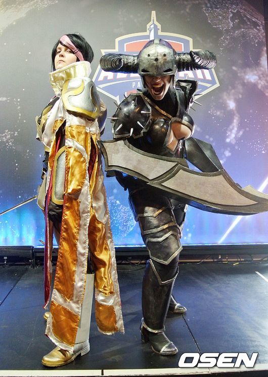 9일(이하 한국시간) 프랑스 파리 르 제니스 아레나에서 열린 'LOL 올스타 2014 '(이하 '롤 올스타전')에서 롤 챔피언인 피오라와 어둠불꽃 쉬바나가 의상을 갖춰입고 코스튬플레이를 펼지고 있다.