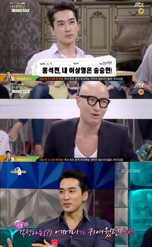 송승헌은 영화 '인간중독'의 홍보 때문에 '마녀사냥'에 출연했지만, 신동엽과의 친분을 바탕으로 다양한 에피소드를 쏟아낸 것은 물론, 자신을 이상형이라고 밝혔던 홍석천과의 만남만으로도 웃음을 선사했다. 송승헌은 '톱게이' 홍석천이 방송을 통해 자신을 이상형이라고 밝혀, 어머니가 자신을 게이라고 오해할 뻔했던 일화를 전해 눈길을 끌었던 것. 이 이야기는 '라디오스타'에서도 언급됐지만, 실제 당사자인 홍석천과 함께 이야기 하는 송승헌의 이야기에는 생기가 더해져 또 다른 이야기를 만들어냈다. 홍석천은 그의 외모와 포스를 찬양하며 이상형이라고 언급했던 이유를 설명했다.