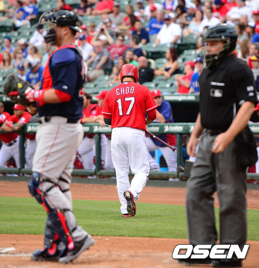 10일(이하 한국시각) 미국 텍사스주 알링턴 글로브 라이프 파크에서 열린 '2014 메이저리그' 텍사스 레인저스와 보스턴 레드삭스의 경기 1회말 선두타자 추신수가 루킹 삼진을 당하고 덕아웃으로 향하고 있다.