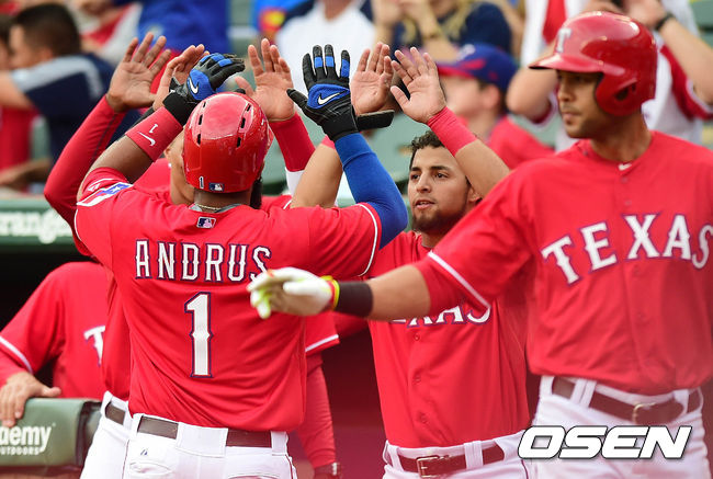 10일(이하 한국시각) 미국 텍사스주 알링턴 글로브 라이프 파크에서 열린 '2014 메이저리그' 텍사스 레인저스와 보스턴 레드삭스의 경기 1회말 1사 1루 벨트레의 1타점 2루타에 득점한 앤드루스가 덕아웃에서 동료들과 하이파이브를 하고 있다.