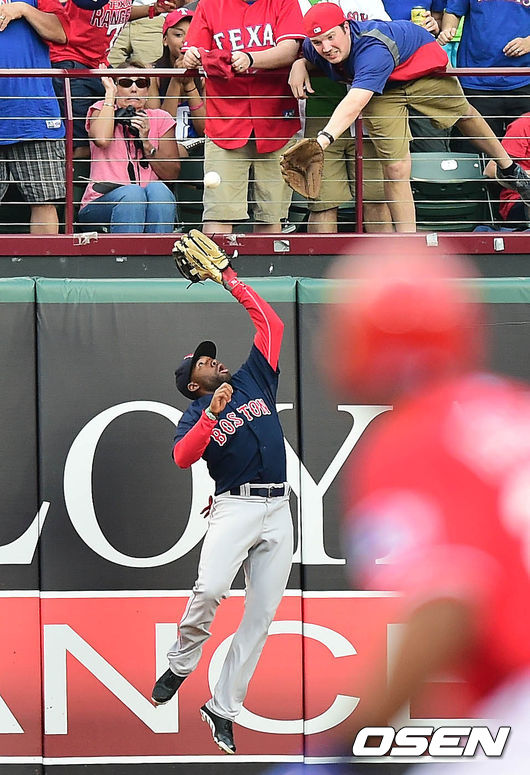 10일(이하 한국시각) 미국 텍사스주 알링턴 글로브 라이프 파크에서 열린 '2014 메이저리그' 텍사스 레인저스와 보스턴 레드삭스의 경기 1회말 1사 2루 프린스 필더의 외야 플라이 타구를 중견수 브래들리가 잡고 있다.