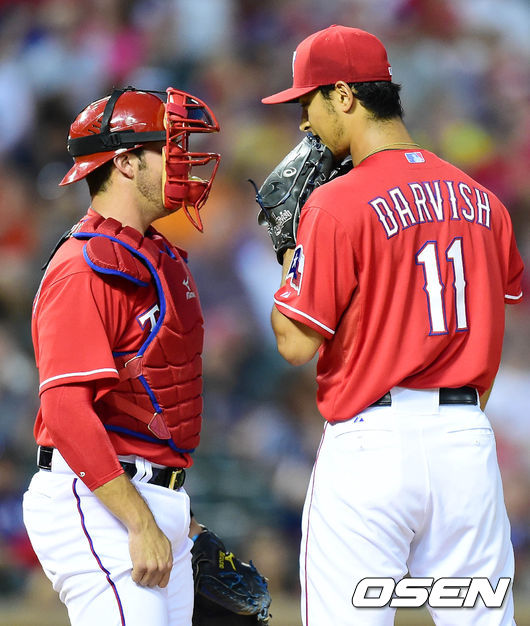 10일(이하 한국시각) 미국 텍사스주 알링턴 글로브 라이프 파크에서 열린 '2014 메이저리그' 텍사스 레인저스와 보스턴 레드삭스의 경기 4회초 2사 데이빗 오티스 타석, 다르빗슈와 알렌시비아가 이야기를 나누고 있다.