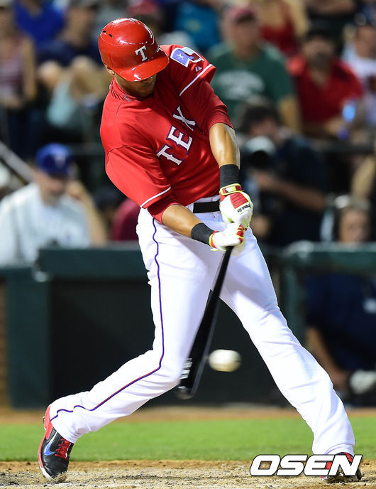 10일(이하 한국시각) 미국 텍사스주 알링턴 글로브 라이프 파크에서 열린 '2014 메이저리그' 텍사스 레인저스와 보스턴 레드삭스의 경기 5회말 1사 1,2루 리오스가 1타점 적시타를 치고 있다.