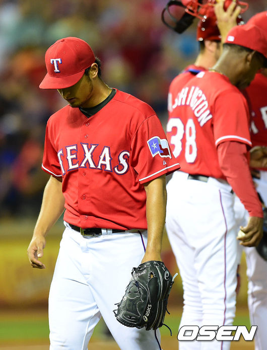 오티스에게 안타를 허용해 노히트노런이 깨진 다르빗슈가 마운드를 내려가고 있다./ baik@osen.co.kr