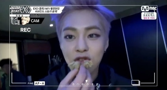 시우민은 지난 9일 방송된 케이블채널 Mnet '뜨거운 순간 엑소'에서 뮤직비디오 촬영 전 모카빵을 폭풍 흡입하는 모습이 포착됐다.