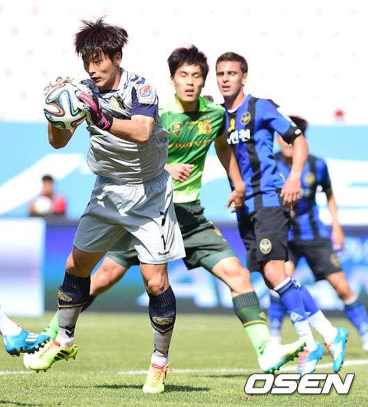후반 전북 골키퍼 권순태가 인천의 센터링을 한발 앞서 잡아내고 있다.
