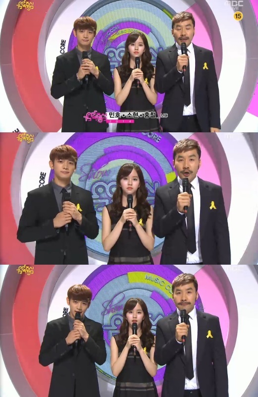 '쇼! 음악중심'의 MC 노홍철, 샤이니 민호, 김소현이 노란 리본을 달고 세월호 참사를 애도했다.