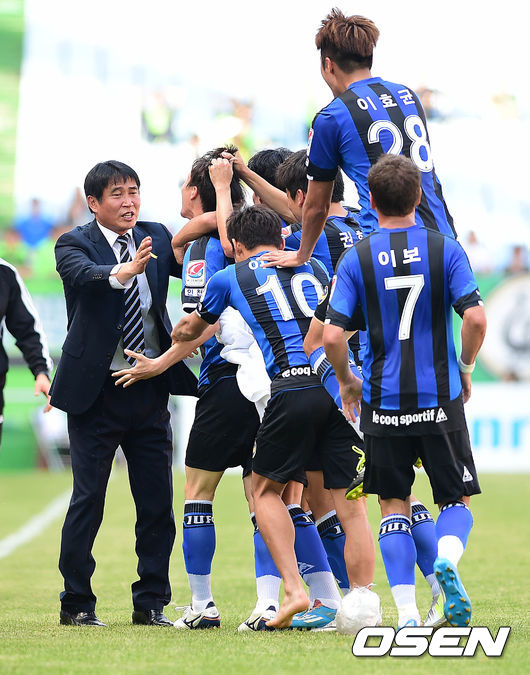후반 추가시간 극적인 동점골을 터트린 인천 조수철이 김봉길 감독과 동료들과 함께 기뻐하고 있다./dreamer@osen.co.kr