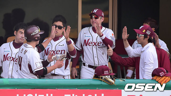 1회말 1사 2루에서 넥센 이택근의 중전 적시 2루타때 홈을 밟은 2루주자 서건창이 더그아웃에서 동료들과 하이파이브를 하고 있다.
