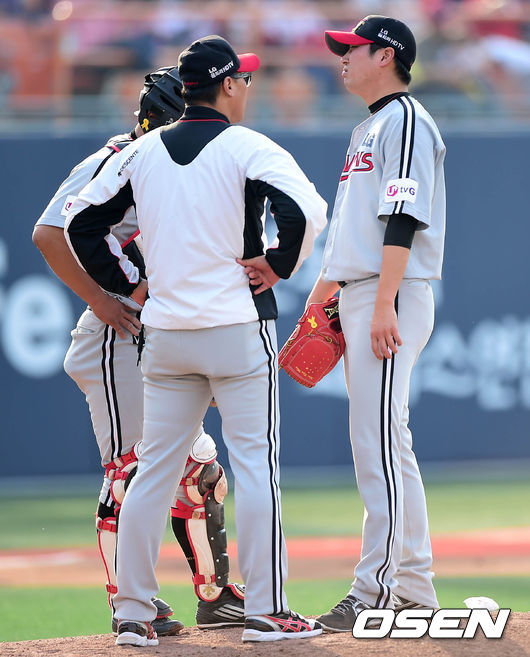 1회말 1사 만루에서 마운드를 방문한 LG 강상수 코치가 포수 최경철, 투수 우규민과 이야기를 나누고 있다.