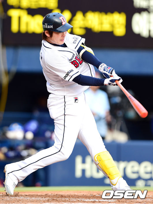 4회말 1사 1루에서 두산 이원석이 1타점 적시 2루타를 날리고 있다.