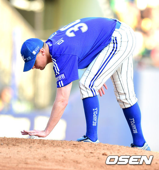 4회말 1사 1루에서 삼성 마틴이 두산 이원석에 1타점 적시 2루타를 허용하고 아쉬워하며 볼에 송진 가루를 묻히고 있다.