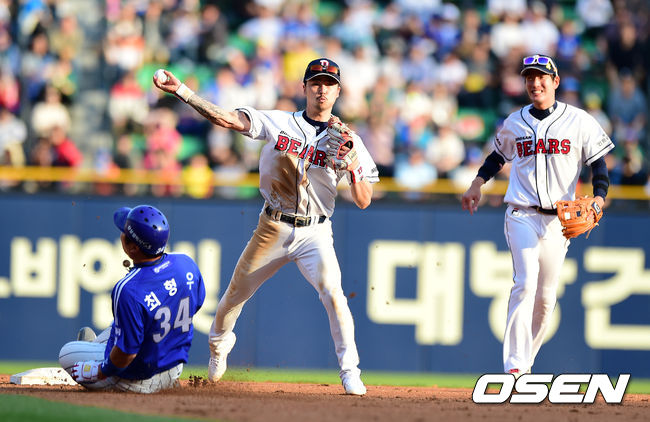 4회초 무사 1루에서 두산 오재원이 삼성 박석민의 2루땅볼에 최형우를 포스아웃시키고 1루로 송구하고 있다.