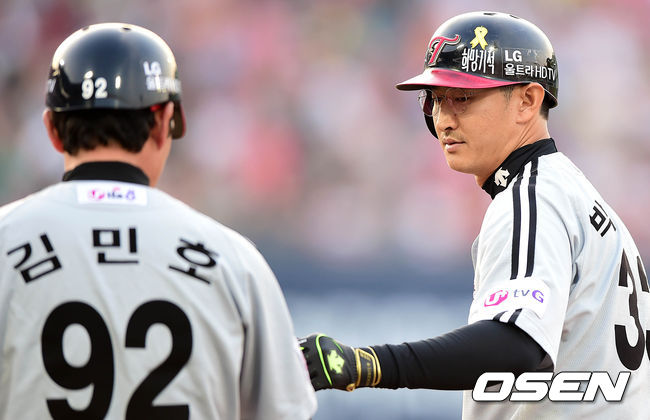 5회초 2사 3루에서 LG 박용택이 중전 적시타를 치고 김민호 코치가 하이파이브를 하고 있다.