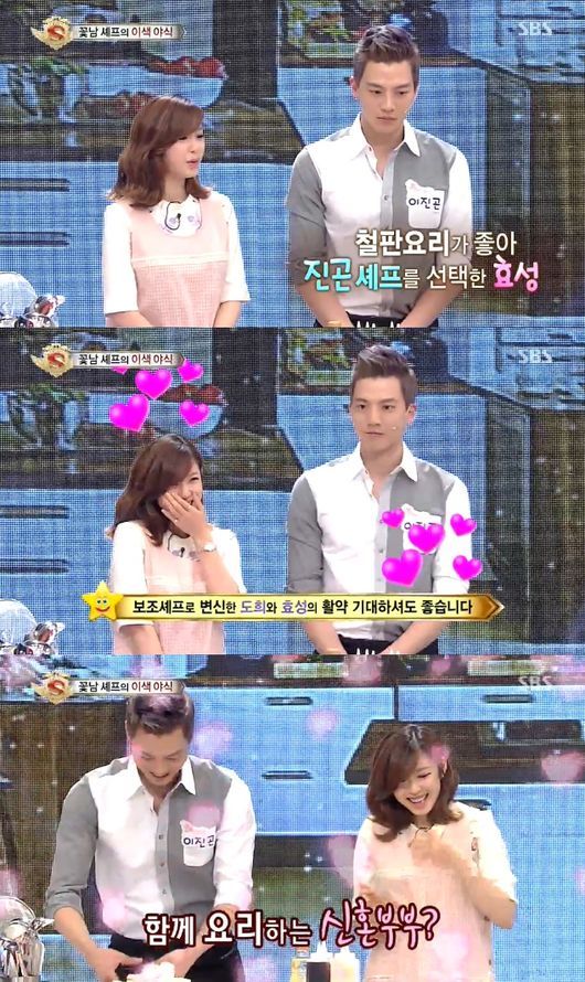 분홍색 앞치마를 입은 전효성은 이진곤 셰프 옆에서 보조, 마치 신혼부부 같은 분위기를 연출해 눈길을 끌었다.