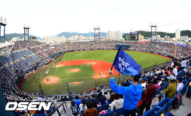 10일 오후 경남 마산구장에서 열린 '2014 한국야쿠르트 세븐 프로야구' NC 다이노스와 롯데 자이언츠의 경기, 올시즌 첫 번째 13,700개의 모든 좌석이 매진된 가운데 경기가 펼쳐지고 있다.