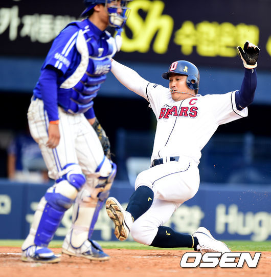 5회말 무사 2,3루에서 두산 홍성흔이 김재호의 우익수 희생플라이에 홈을 밟고 있다.