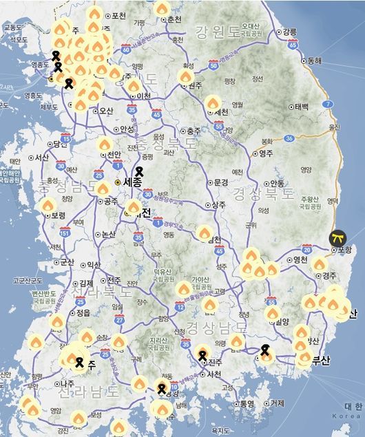최근 한 시민단체가 세월호 참사 희상자들을 추모하고, 진실을 촉구하는 촛불 집회가 열리는 장소가 표시된 '우리 동네 촛불 지도'를 공개했다.