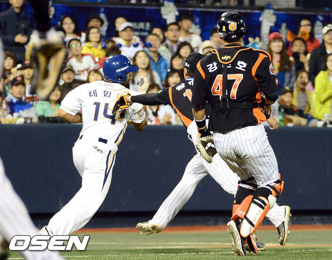 10일 오후 경남 마산구장에서 열린 '2014 한국야쿠르트 세븐 프로야구' NC 다이노스와 롯데 자이언츠의 경기, 7회초 1사 1,3루 손시헌의 투수앞 땅볼때 3루주자 테임즈가 협살에 걸려 3루수 황재균에게 태그아웃 되고 있다.
