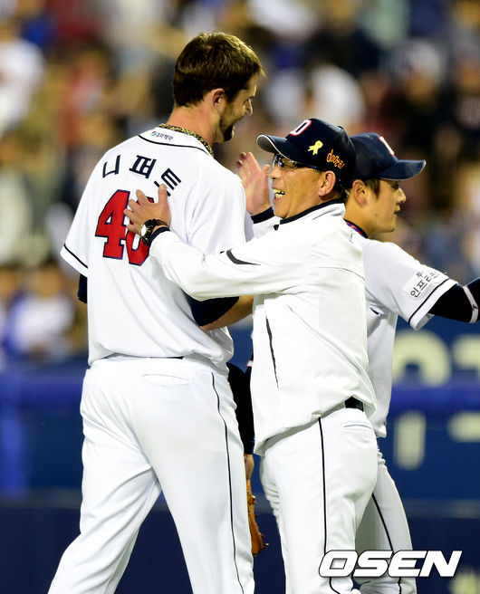경기후 두산 송일수 감독이 니퍼트의 완투승을 축하해 주고 있다. /jpnews@osen.co.kr