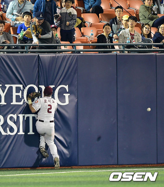 9회초 넥센 로티노가 LG 이병규의 파울 타구를 놓치며 펜스에 부딪히고 있다.