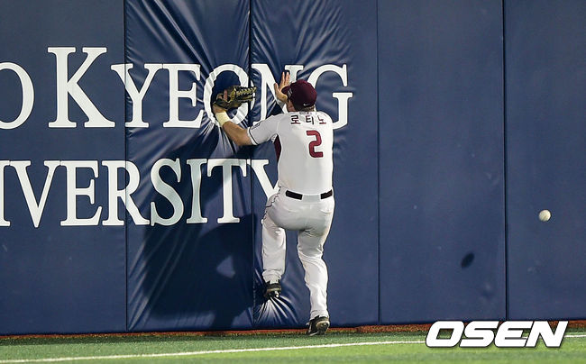 9회초 넥센 로티노가 LG 이병규의 파울 타구를 놓치며 펜스에 부딪히고 있다.