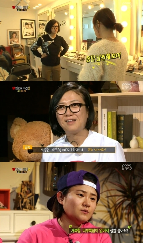 김숙은 10일 오후 방송된 KBS 2TV 예능프로그램 '인간의 조건'에서 지인에게 “살 빠진 것 같다. 날씬해 졌다”라는 말을 듣고 즐거워하는 모습이 전파를 탔다.