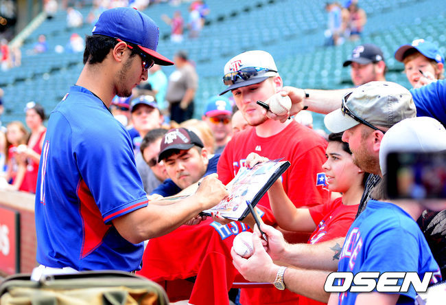 11일(이하 한국시각) 미국 텍사스주 알링턴 글로브 라이프 파크에서 열리는 '2014 메이저리그' 텍사스 레인저스와 보스턴 레드삭스의 경기 시작전 다르빗슈가 팬들에게 사인을 해주고 있다.