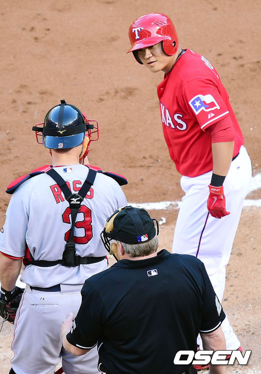 11일(이하 한국시각) 미국 텍사스주 알링턴 글로브 라이프 파크에서 열린 '2014 메이저리그' 텍사스 레인저스와 보스턴 레드삭스의 경기 1회말 선두타자 추신수가 타석에 들어서며 인사를 하고 있다.