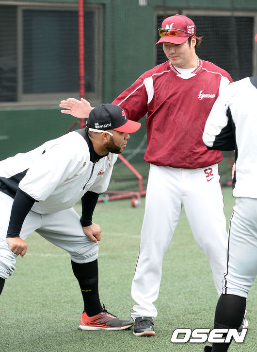 11일 오후 서울 목동구장에서 열린 '2014 한국야쿠르트 세븐 프로야구' 넥센 히어로즈와 LG 트윈스의 경기전 넥센 박병호와 LG 조쉬벨이 이야기를 나누고 있다.