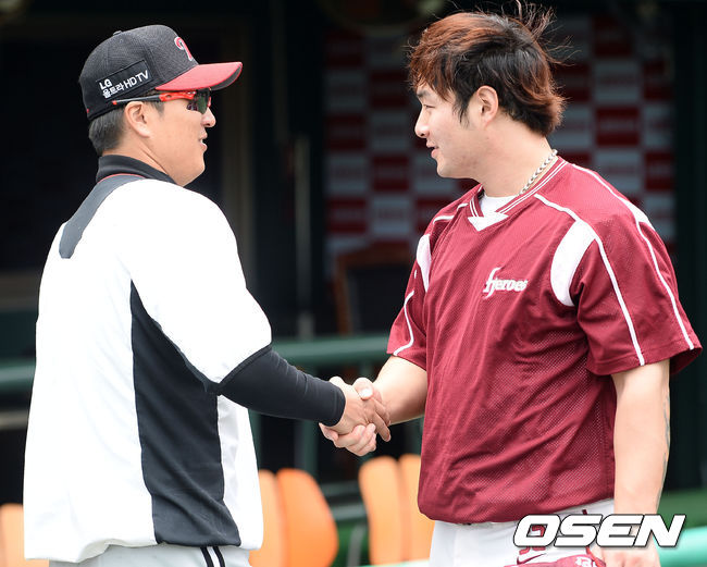 11일 오후 서울 목동구장에서 열린 '2014 한국야쿠르트 세븐 프로야구' 넥센 히어로즈와 LG 트윈스의 경기전 넥센 박병호가 LG 이진영에게 인사를 하고 있다.
