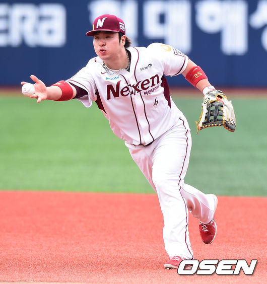 11일 오후 서울 목동구장에서 열린 '2014 한국야쿠르트 세븐 프로야구' 넥센 히어로즈와 LG 트윈스의 경기, 1회초 1사 LG 이병규의 안타성 타구를 호수비 펼치며 잡아낸 뒤 오재영 투수에게 토스하고 있다.