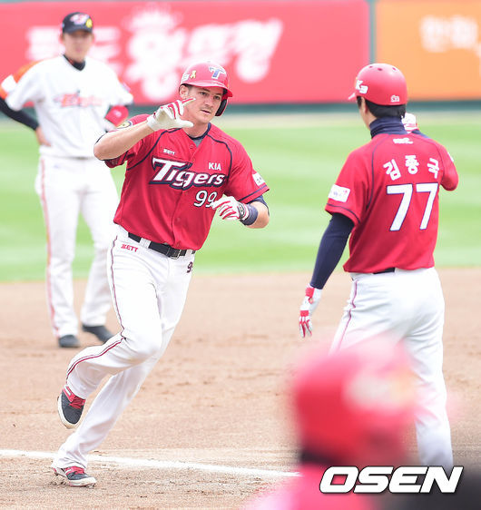 1회초 KIA 공격 무사 1, 3루 필이 선제 좌월 스리런포를 날리고 그라운드를 돌며 김종국 코치와 인사를 나누고 있다.