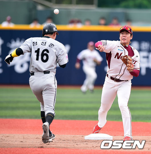 11일 오후 서울 목동구장에서 열린 '2014 한국야쿠르트 세븐 프로야구' 넥센 히어로즈와 LG 트윈스의 경기, 2회초 1사 1루 LG 박용택의 병살타때 넥센 강정호 유격수가 1루 주자 정성훈을 포스아웃시킨뒤 1루로 송구하고 있다.