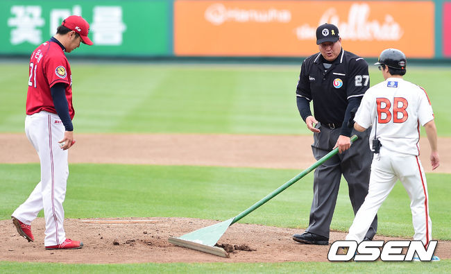 1회말 한화 공격을 앞두고 마운드에 오른 KIA 선발 송은범의 요청으로 최수원 주심과 배트보이가 마운드를 정리하고 있다.