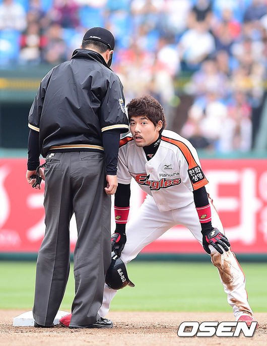 1회말 한화 공격 무사 1루 상황 도루를 시도한 KIA 이용규가 도루를 실패한 뒤 아쉬워하고 있다.