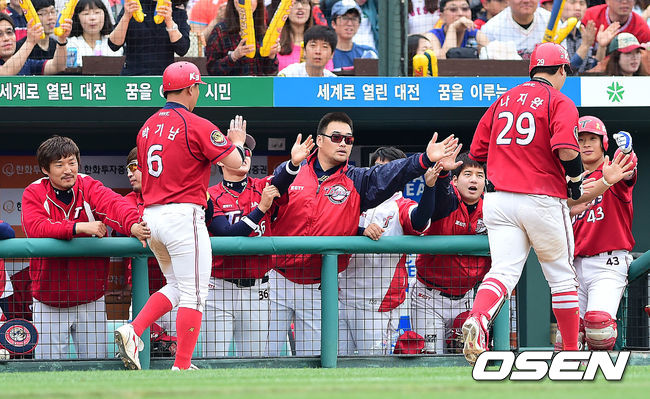 3회초 KIA 공격 무사 2, 3루 상황 나지완이 1타점 희생플라이를 날리고 더그아웃 동료들과 인사를 나누고 있다.
