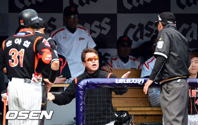 11일 오후 경남 창원 마산구장에서 열린 '2014 한국야쿠르트 세븐 프로야구' NC 다이노스와 롯데 자이언츠의 경기, 3회초 1사 1,2루 타석 김문호의 내야땅볼때 1루주자 박준서가 2루에 뛰어들다 오른손에 볼을 맞아 수비방해가 인정돼 아웃되었다. 이 판정에 롯데 김시진 감독이 심판에게 어필하고 있다.