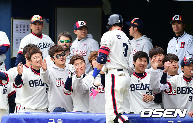 3회말 무사 1루 두산 칸투가 우측 담장을 넘기는 투런 홈런을 때린 뒤 동료들과 기뻐하고 있다.