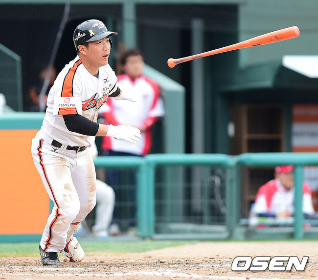 3회말 한화 공격 1사 3루 상황 정근우가 1타점 우익수 희생플라이를 날리고 있다.