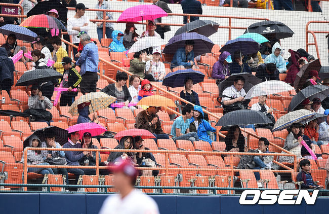 11일 오후 서울 목동구장에서 열린 '2014 한국야쿠르트 세븐 프로야구' 넥센 히어로즈와 LG 트윈스의 경기, 5회말 갑자기 내리는 비에도 수많은 야구팬들이 우산을 쓴채 관전하고 있다.