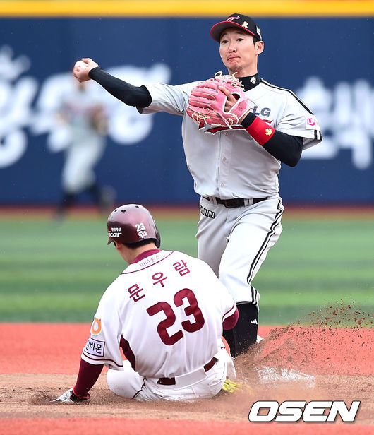 11일 오후 서울 목동구장에서 열린 '2014 한국야쿠르트 세븐 프로야구' 넥센 히어로즈와 LG 트윈스의 경기, 6회말 1사 1루 넥센 이택근의 병살타때 LG 손주인 2루수가 1루 주자 문우람을 포스아웃시킨뒤 1루로 송구하고 있다